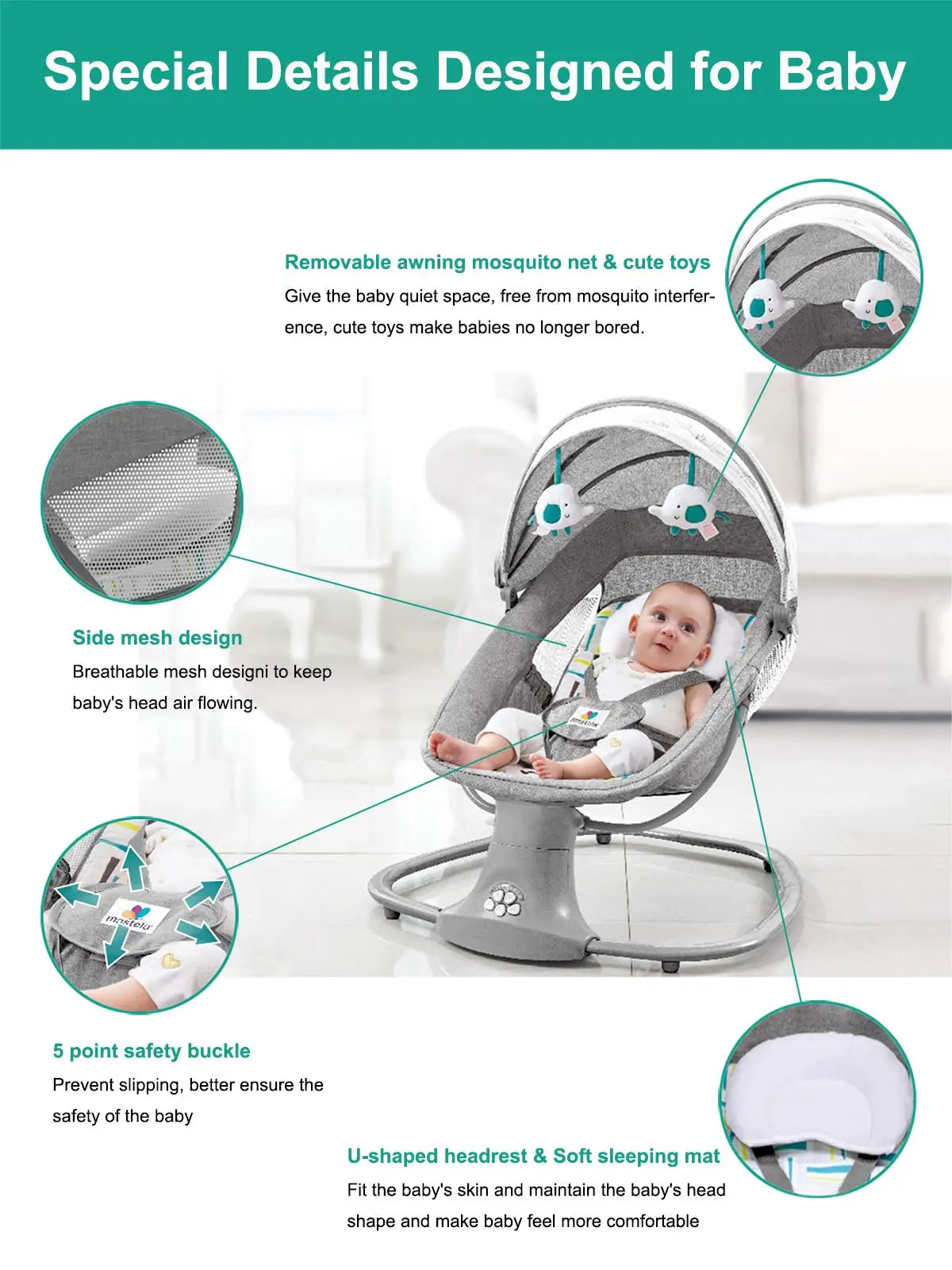 Den smarte vugge hjælper din baby med at få en afslappende søvn, mens den lydsvage motor vugger det blidt i søvn.Og det stilfulde stativ giver mulighed for mere og bedre søvn overalt i dit hjem. Lastkapacitet den er op til 20kg.
